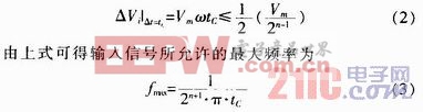 峰值保持电路具有保持和采样2个状态。处于采样状态时,电路的输出始终跟随输入信号;处于保持状态时,电路的输出保持着前一次采样结束前瞬间的输入模拟量。在高速脉冲峰值采集过程中,为保证A/D转换精度,在转换过程中其输入信号变化量不能大于1/2 LSB。假设输入信号Vi=Vmsinωt,则Vi的最大变化率为