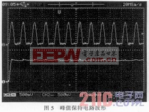 ,对于100 kHz的模拟信号,峰值保持电路可以准确地采集到峰值并保持,同时向单片机发出请求中断信号,启动A/D转换器。A/D转换完成后,保持电容迅速放电,等待下一个脉冲的到来。