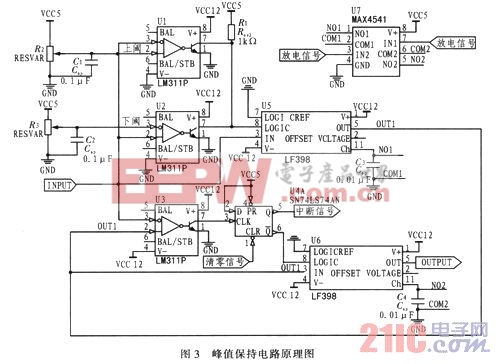 图3是峰值保持电路原理图,该电路主要由幅度判别、波形采样、峰值保持、电荷泄放等部分组成,幅度判别采用高速低功耗电压比较器LM311实现,电压上阈、下阈由可调精密电位器分压获得。由于LM311输出端集电极开路,将U1,U2输出端接上拉电阻可实现“线与”功能;采用NationalSemiconductor公司的采样保持芯片IF398实现采样/保持功能,其控制端可直接接于TTL、CMOS逻辑电平,LOGIC引脚电平决定电路处于采样/保持状态。模拟开关MAX4541接收单片机控制信号,控制保持电容C3、C4充放电。若输入信号Vi幅度处于上下阈之间,U1、U2同时输出高电平,“线与”后得到高电平送到U5的LOGIC管脚,U5处于采样状态,输出OUT1跟随输入信号Vi变化。峰值没有到来时,OUT1Vi,比较器U3输出低电平,D触发器U4不触发,A/D转换不启动,模拟开关U7断开,电容充电。当峰值到来时,U1、U2、U5状态不变,而由于OUT1Vi,U3输出高电平,产生上升沿,D触发器U4被触发,/Q输出低电平,U6处于保持状态,将OUT1输出的峰值保持住,并送至A/D转换器;同时Q输出高电平,向单片机发送中断信号,通知单片机峰值到来,单片机收到中断信号后启动A/D转换。A/D转换完成后,单片机向D触发器发出清零信号,同时控制模拟开关U7闭合,保持电容C3,C4放电,等待下一个脉冲的到来。