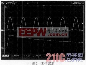 为验证文中电路的可行性,用盛谱科技公司的F05型任意波信号发生器产生幅度为1V、频率为100 kHz的脉冲信号作为输入,用同惠电子公司的TD01000型双通道示波器观察输入输出电压波形,如图5所示,波形1为峰值保持电路输入信号波形,波形2为峰值保持稳定后的信号波形。从图中可以看出,文中设计的峰值保持电路较好地保持了输入信号的峰值,起伏较小。电路保持住的峰值与输入信号峰值误差1%,满足A/D转换的要求。