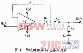 传统的峰值保持电路原理图如图1所示,由集成运算放大器,二极管和电容构成。图2为其工作波形,其中波形1为输入信号波形,波形2为开关K1打开后峰值保持的波形。