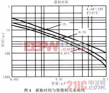保持电容对于电路精度具有很大影响。电容及其容值的选择应综合考虑下降误差、采样保持偏差、采样频率、精度等指标。保持电容产生误差的主要原因是感应吸收,即电容两端在电压急剧变化时,产生电容值下降的现象。经测试发现:电容两端电压在1μs内由10 V降至100 mV时,聚脂薄膜电容约变化0.8%,陶瓷电容变化在1%以上,本电路中保持电容C3、C4选用感应吸收与漏电流均较小的聚苯乙烯电容。容值的选取参照如图4所示曲线。容值选的过小,则峰值保持时间会缩短;选的过大,则电容充放电时间过长。综合以上因素,C3、C4电容值取0.01μF。
