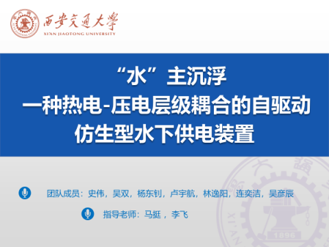 【项目介绍】随着国际形势的日益严峻,布防数量多、体积小、工作持久的水下监测器是保证我国海洋安全的重要措施之一。然而现有水下监测器大多采用蓄电池等供能方式,存在需要定期维护更换、消耗大量人力物力等问题。为此,本项目综合利用海洋的温差能和海流能,提出了一种热电-压电层级耦合的自驱动仿生型水下供电装置,将压电发电部分作为基础层级以实现装置的自启动;将热电发电部分作为更高层级,并通过相变材料储热实现在空间上对海洋温差能的自主捕获,进而使得发电功率显著提升;提出水母仿生外形以降低在水中的行进阻力和规避水下生物的攻击,本作品已申请国家发明专利一项。通过理论分析、数值仿真、原理装置制备和性能测试,发现其发电功率明显高于公开资料的能量收集装置,初步验证了该设计的可行性。